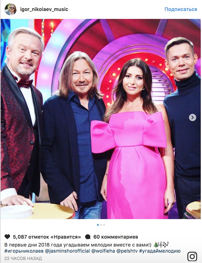 Однако сегодня Игорь Николаев опубликовал снимок, на котором она запечатлен в компании певицы Жасмин и ведущего шоу «Угадай мелодию».