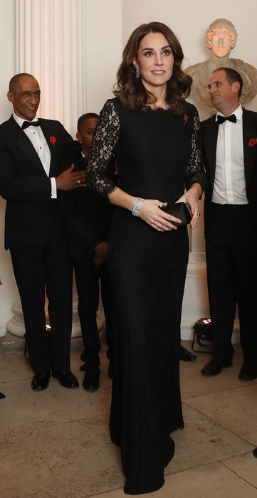 Для мероприятия Кейт выбрала кружевное черное платье в пол Diane von Furstenberg. Прекрасным дополнением наряда послужила брошь в виде цветка — символ Центра Анны Фрейд.