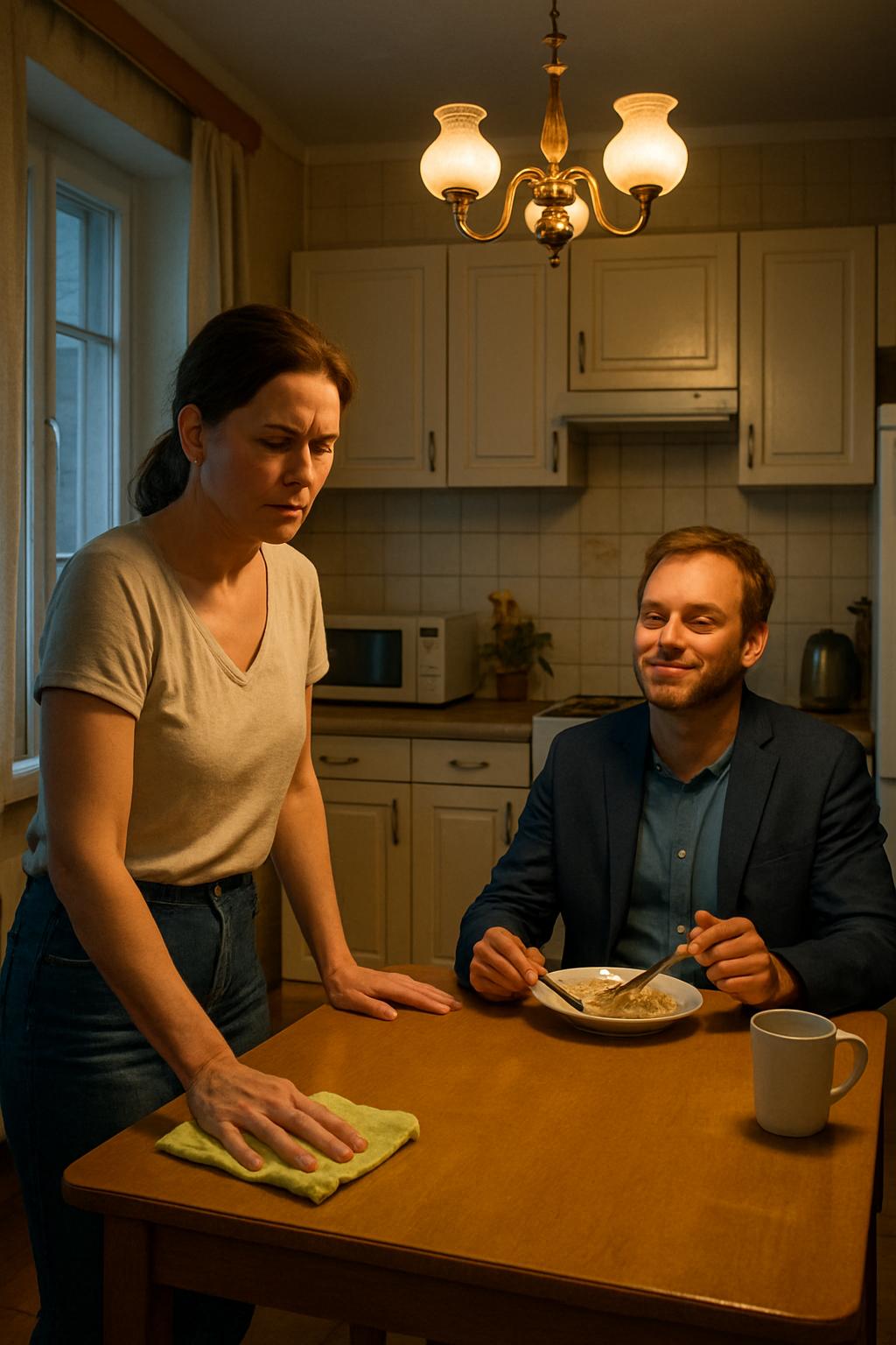 Она не сводила взгляда с Дмитрия, устроившегося напротив за кухонным столом. Тот спокойно доедал котлету, будто только что произнёс нечто совершенно обыденное. Тёплый свет люстры мягко ложился на его лицо, подчёркивая лёгкую щетину и самодовольную улыбку человека, недавно получившего премию.