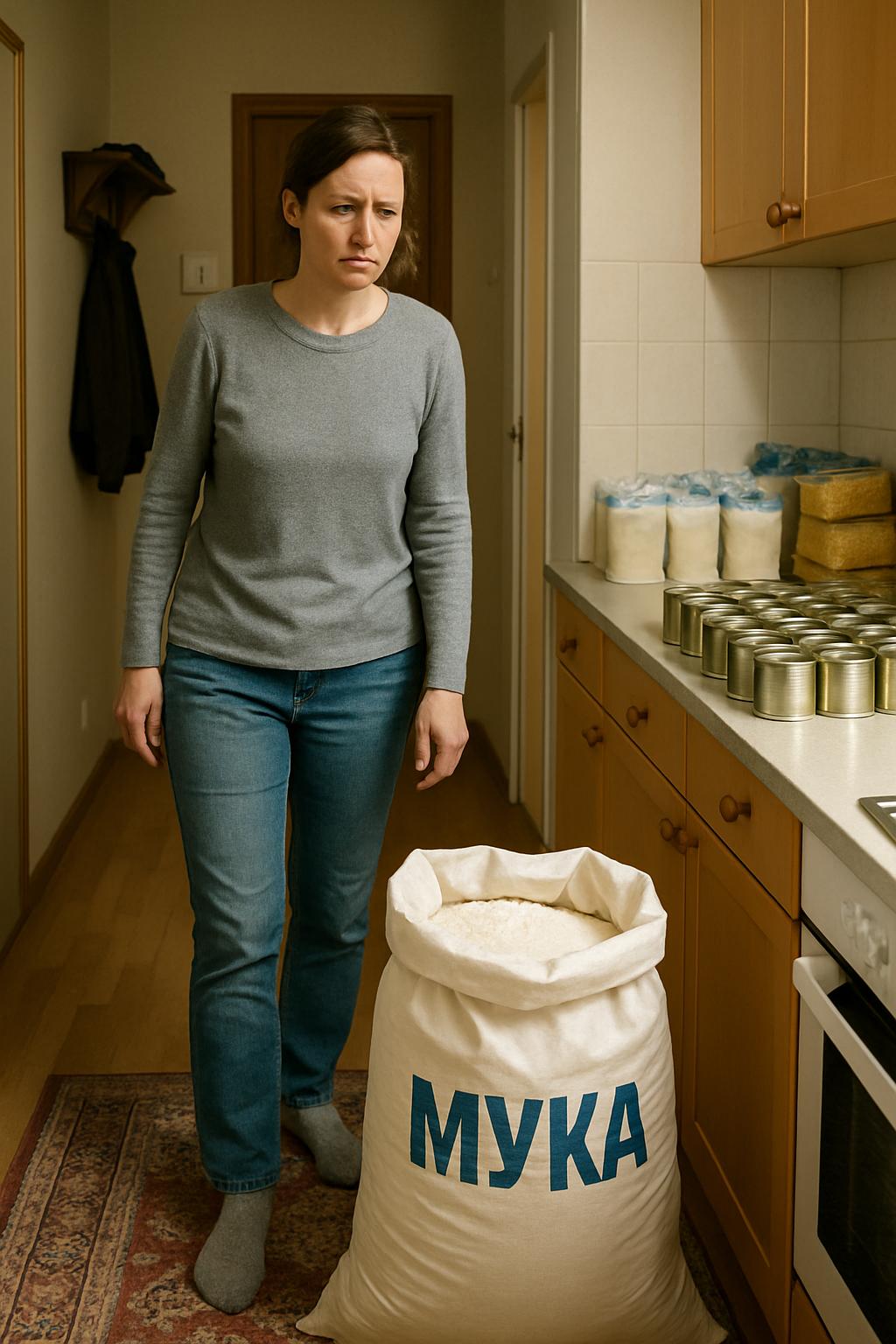 Я ничего не ответила и направилась на кухню. Ноги будто шли сами, а сознание отказывалось верить в увиденное. Там стоял мешок сахара. Рядом — ещё один, с макаронами сероватого цвета, будто их слепили из картона. На столе возвышалась аккуратно выстроенная пирамида консервных банок — с какой-то почти военной точностью.