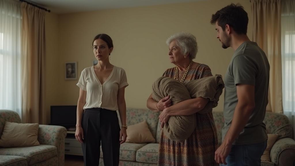 Свекровь, вся раскрасневшаяся от усилий и гордости, держала в объятиях громоздкий свёрток, завернутый в старую простыню.
