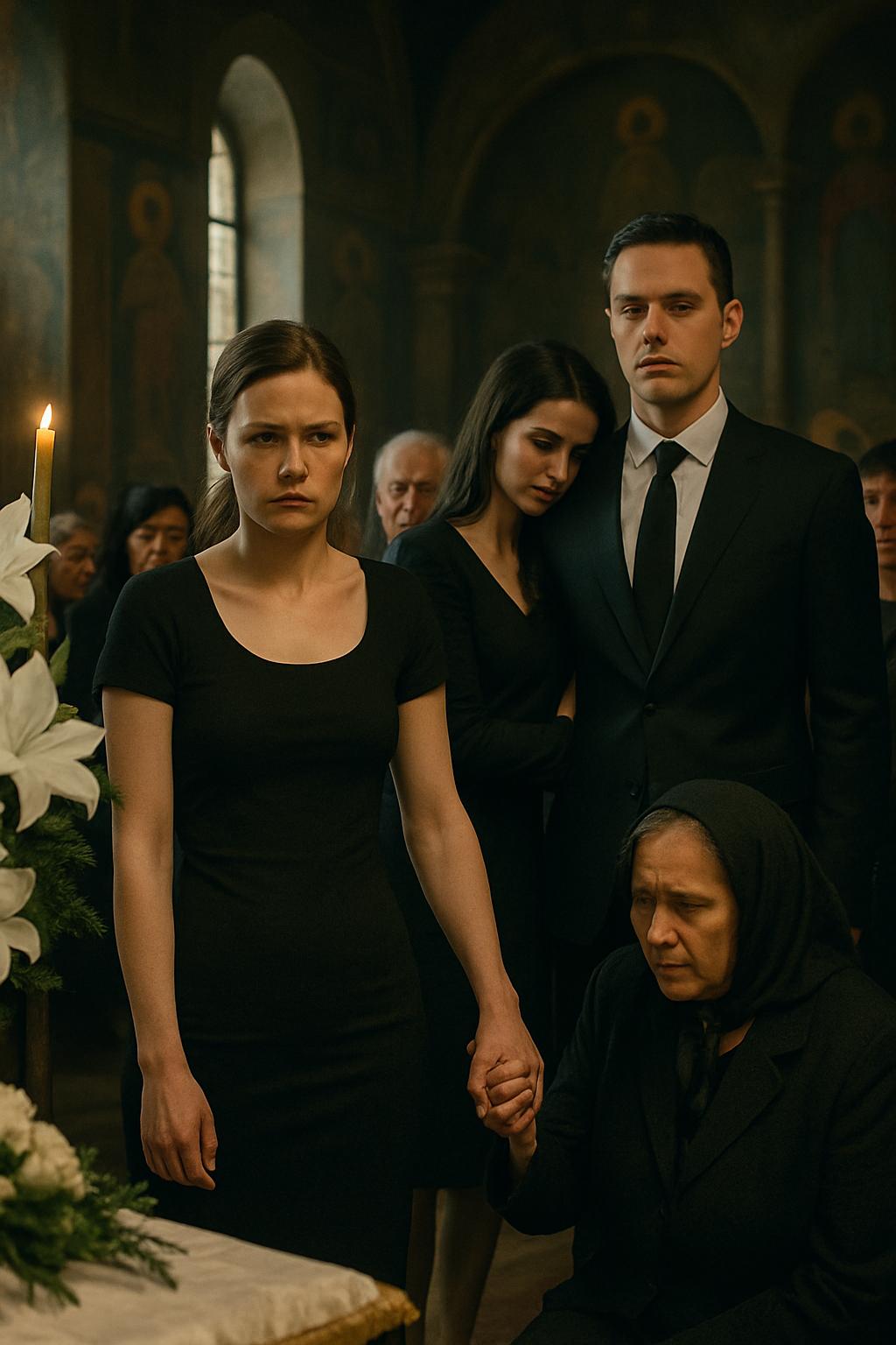 Когда двери распахнулись и Богдан переступил порог, по залу прокатилась волна напряжения. На нём был строгий чёрный костюм, а лицо выражало показное спокойствие. Рядом с ним шла высокая темноволосая женщина в узком траурном платье, крепко державшаяся за его руку так, словно имела на это полное право.