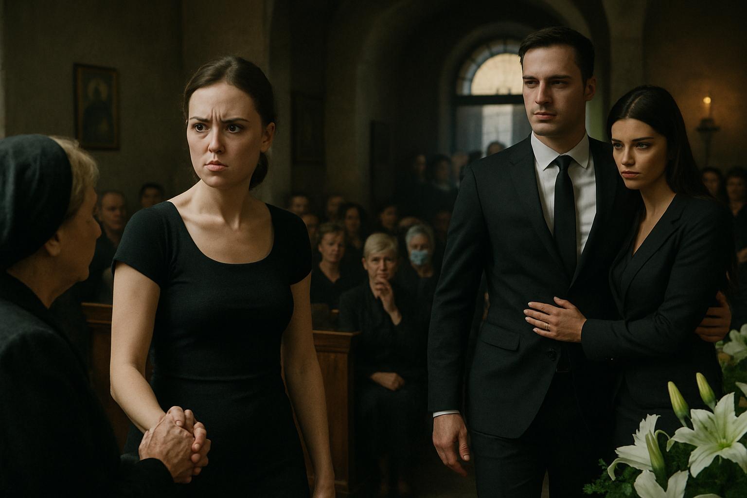Когда двери распахнулись и Богдан переступил порог, по залу прокатилась волна напряжения. На нём был строгий чёрный костюм, а лицо выражало показное спокойствие. Рядом с ним шла высокая темноволосая женщина в узком траурном платье, крепко державшаяся за его руку так, словно имела на это полное право.