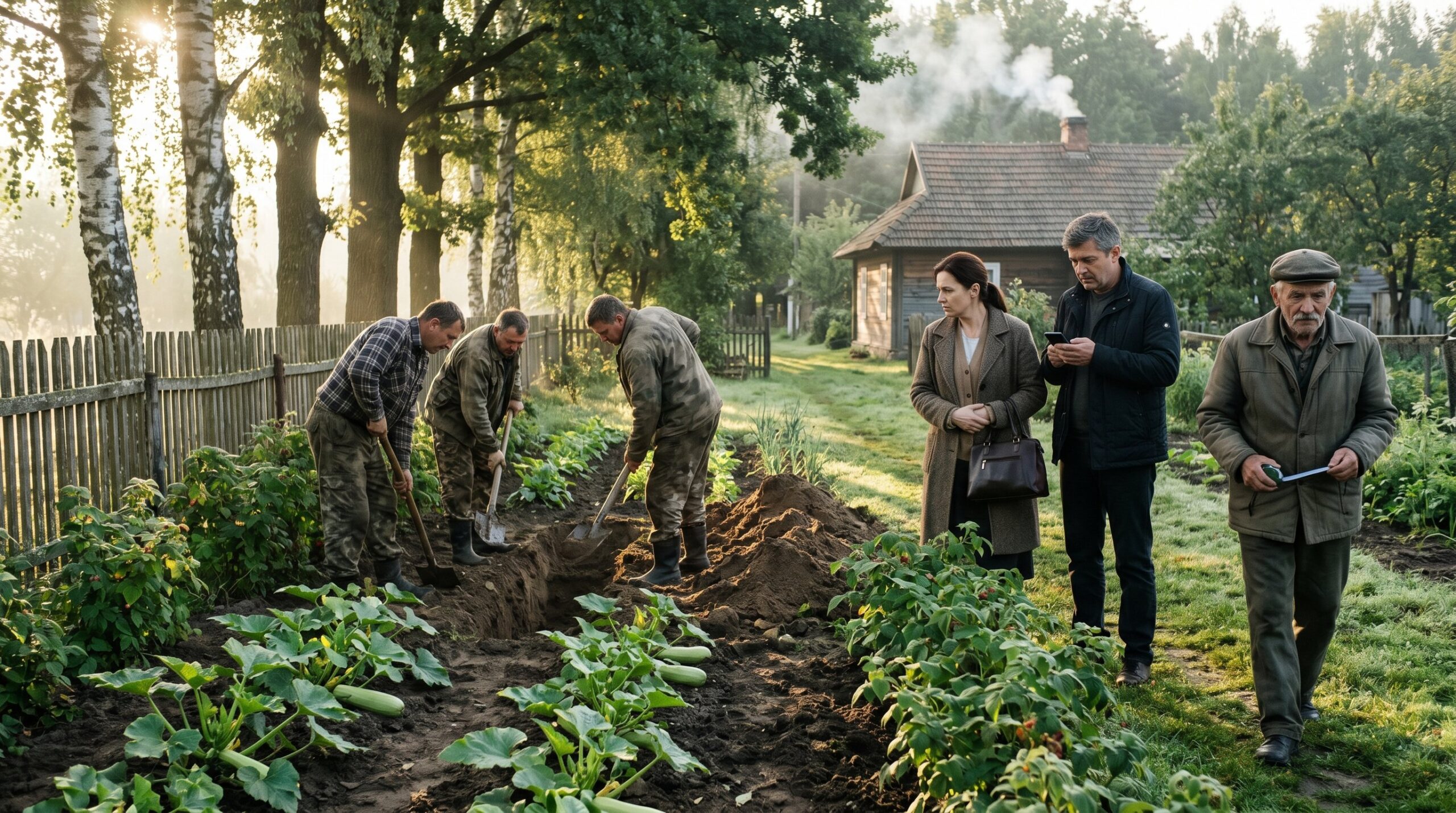 Они только что припарковались и вышли из машины. Было субботнее утро, около половины девятого. Трава ещё блестела от росы, воздух стоял прозрачный и тихий, и потому глухие удары лопат звучали особенно резко. В дальнем углу их земли, там, где Оксана каждое лето высаживала кабачки, трое мужчин уверенно вгрызались в почву.
