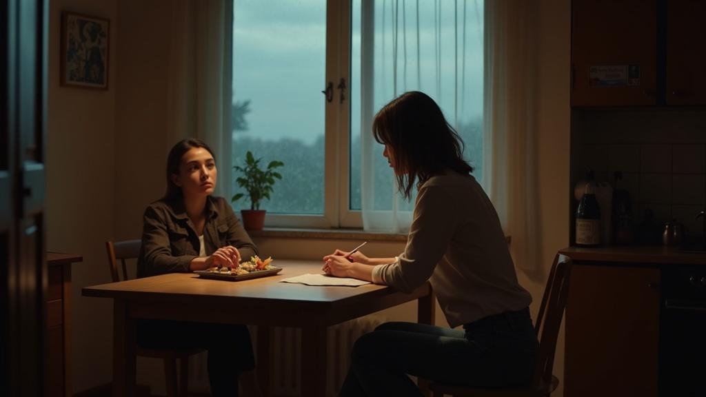 Данило вернулся домой поздно вечером. Оксанка сидела на кухне, глядя в окно. За стеклом моросил дождь, капли медленно стекали вниз. Она провожала их взглядом — одна, вторая, третья… Данило вошёл, стряхнул влагу с куртки и опустился на стул напротив.
