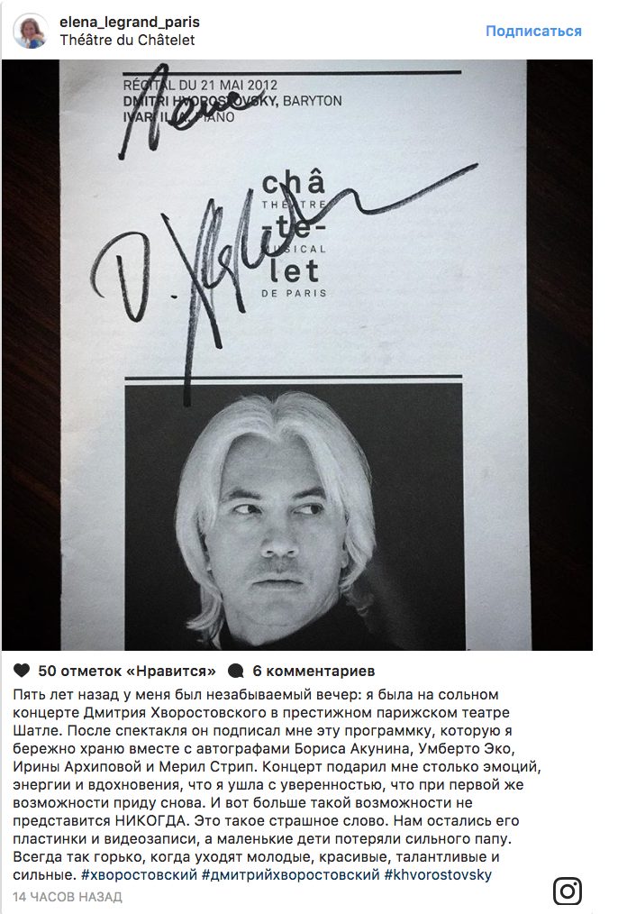 Q.E.P.D. nuestro querido y admirado Dmitri! Un abrazo muy grande Anna desde Santa Rosa La Pampa Argentina!!! ⚘⚘⚘ («Пусть покоится с миром наш любимый и почитаемый Дмитрий! Анна, передаем вам теплые объятия из Санта Роса Ла Пампы, что в Аргентине»), Es ist entsetzlich, der Tod von Dmitri Hvrostovsky, der Gigant der klassischen Musik und der Oper ist von uns gegangen! Schrecklich , Ronald aus Berlin («Это ужасно, смерть гиганта классической музыки и оперы осиротила нас. Страшно. Рональд из Берлина»), – пишут почитатели таланта Дмитрия со всего мира.