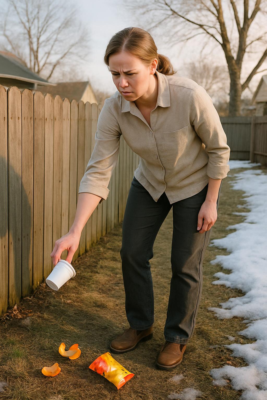 Тем временем ситуация всё больше выводила из себя. Отходы не просто перебрасывали через забор — их пытались скрыть: закапывали в землю, заталкивали в щели между досками, маскировали под опавшей листвой. Создавалось ощущение, что кто-то намеренно старался сделать это незаметно, чтобы мы обнаружили «сюрприз» позже — по запаху или во время прополки. Однажды мы на неделю уехали к родственникам, а когда вернулись, нас ожидала картина похуже прежнего: на трёх клумбах валялись пакеты и жестяные банки, перепачканные засохшим соусом. В тот момент моё терпение окончательно иссякло.