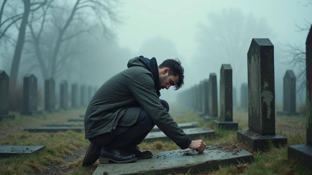 Она остановилась у надгробия, и её плечи затряслись — беззвучные, глубокие рыдания.