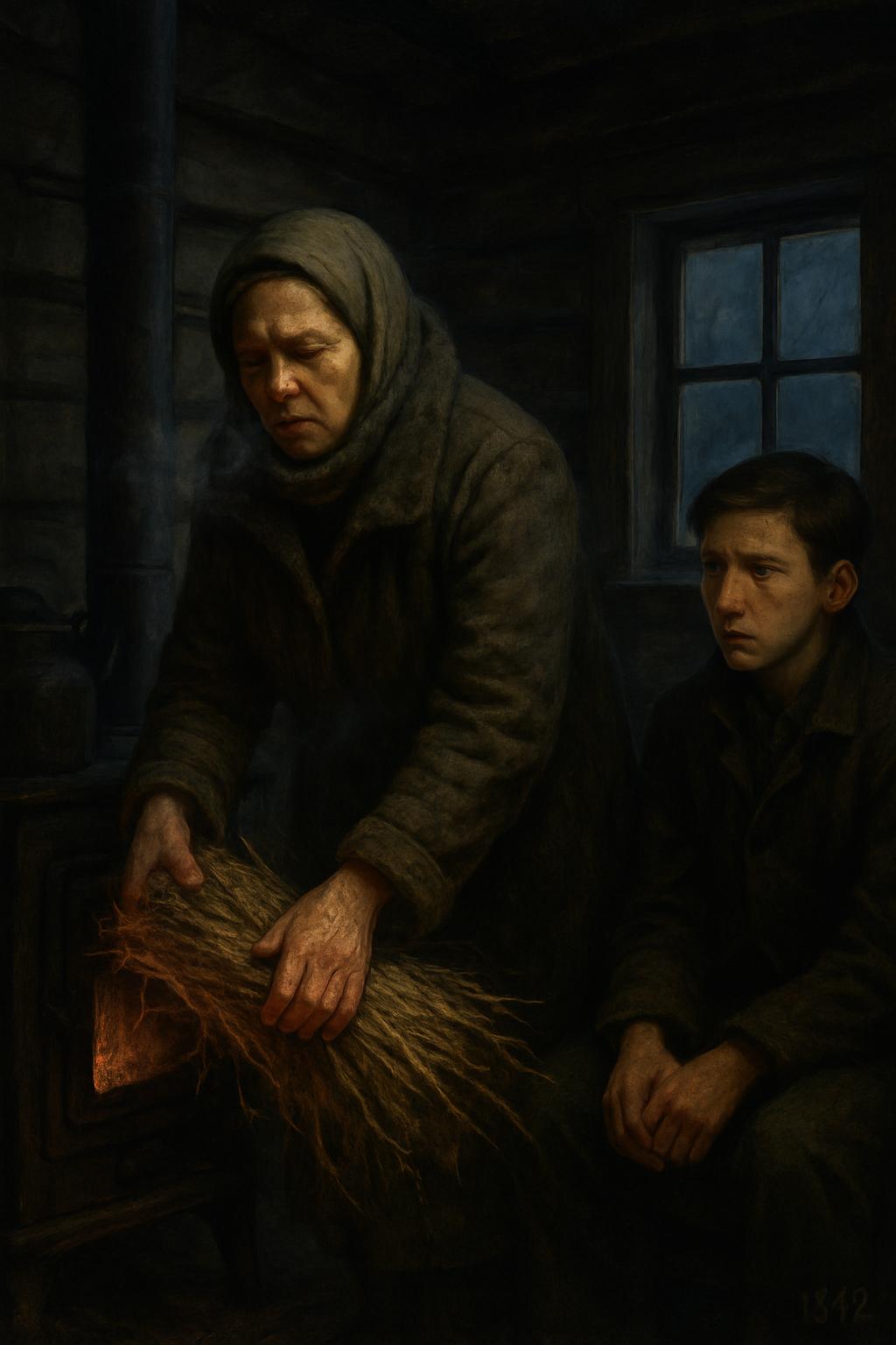 Потом слёзы высохнут сами собой; я всё равно принесу охапку соломы и начну топить печь сам. По доливке с песком начинают бегать красные отблески пламени; становится светлее внутри избы. Я становлюсь на колени перед топкой и осторожно ворочаю жар обугленным кнутовищем…