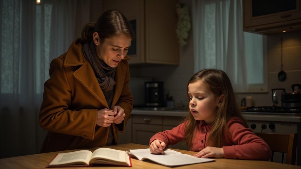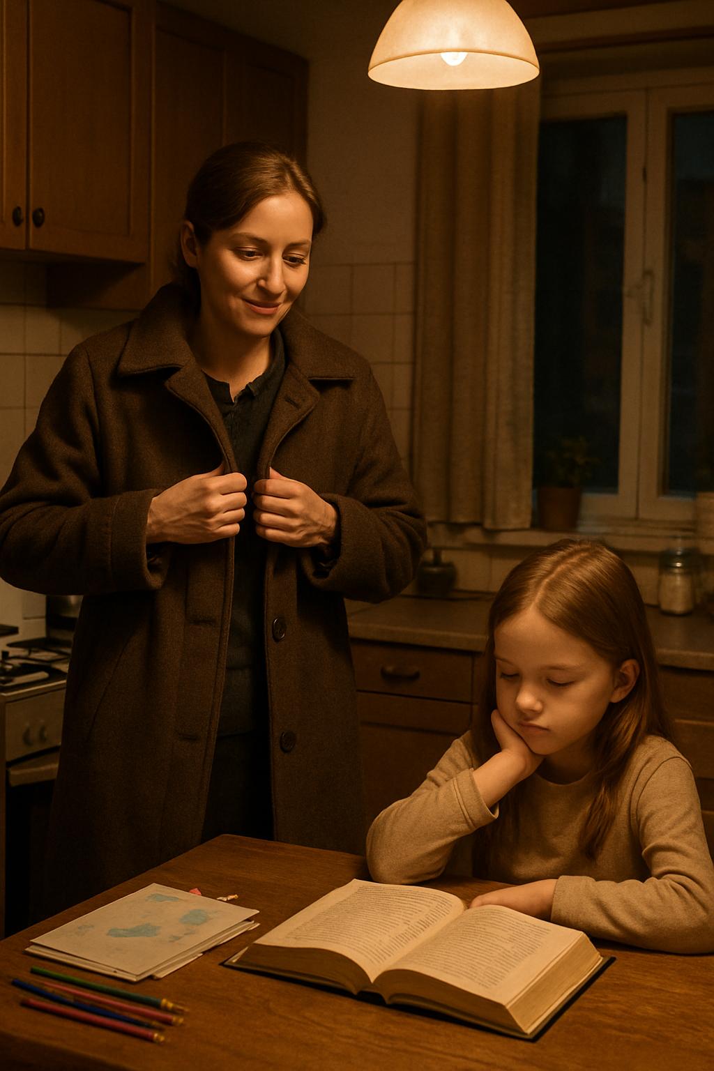 Вечер окутывал кухню мягким, густым светом, словно мёд медленно стекал по мутным оконным стёклам. Комната была скромной, но безукоризненно убранной — всё сверкало после недавней уборки. В воздухе витал аромат вчерашнего борща и что-то детское — смесь бумаги, карандашей и наивной чистоты. Дарина, тридцатичетырёхлетняя женщина с усталым взглядом и лёгкой тревогой в глазах, застёгивала поношенное пальто. Её семилетняя дочь Марта сидела за столом, подперев щёку кулачком, и с серьёзным видом перелистывала толстую книгу без единой иллюстрации.