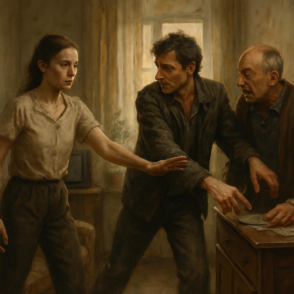 Услышав, как отец громко кричит, я поспешила в дом. Зашла — вижу, цыганин настойчиво пробирается к комоду, где у отца обычно лежали деньги. Прямо напористо так лезет, будто готов сцепиться всерьёз… Когда заметил меня — немного сбавил пыл. Но по выражению лица было ясно: от своих намерений он отступать не собирался…