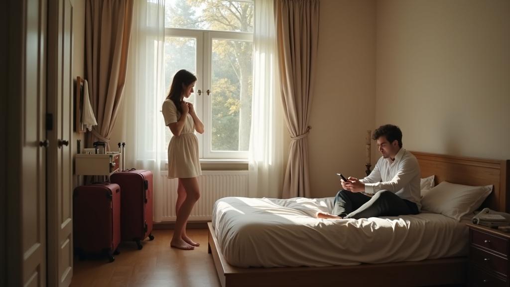 Оксана стояла перед зеркалом в спальне, аккуратно поправляя воротник светлой блузки. В углу комнаты дожидались своего часа два чемодана — всё было собрано ещё вчера. Уже завтра утром их ждал самолёт в Затоку — долгожданное свадебное путешествие, о котором Оксана мечтала весь прошедший год подготовки к торжеству.