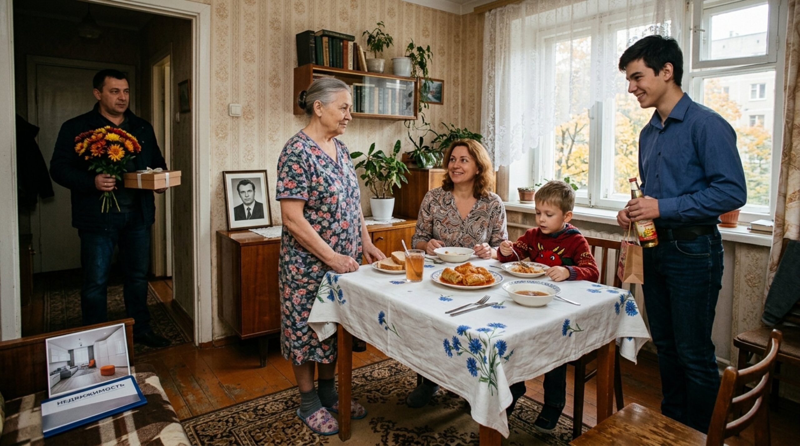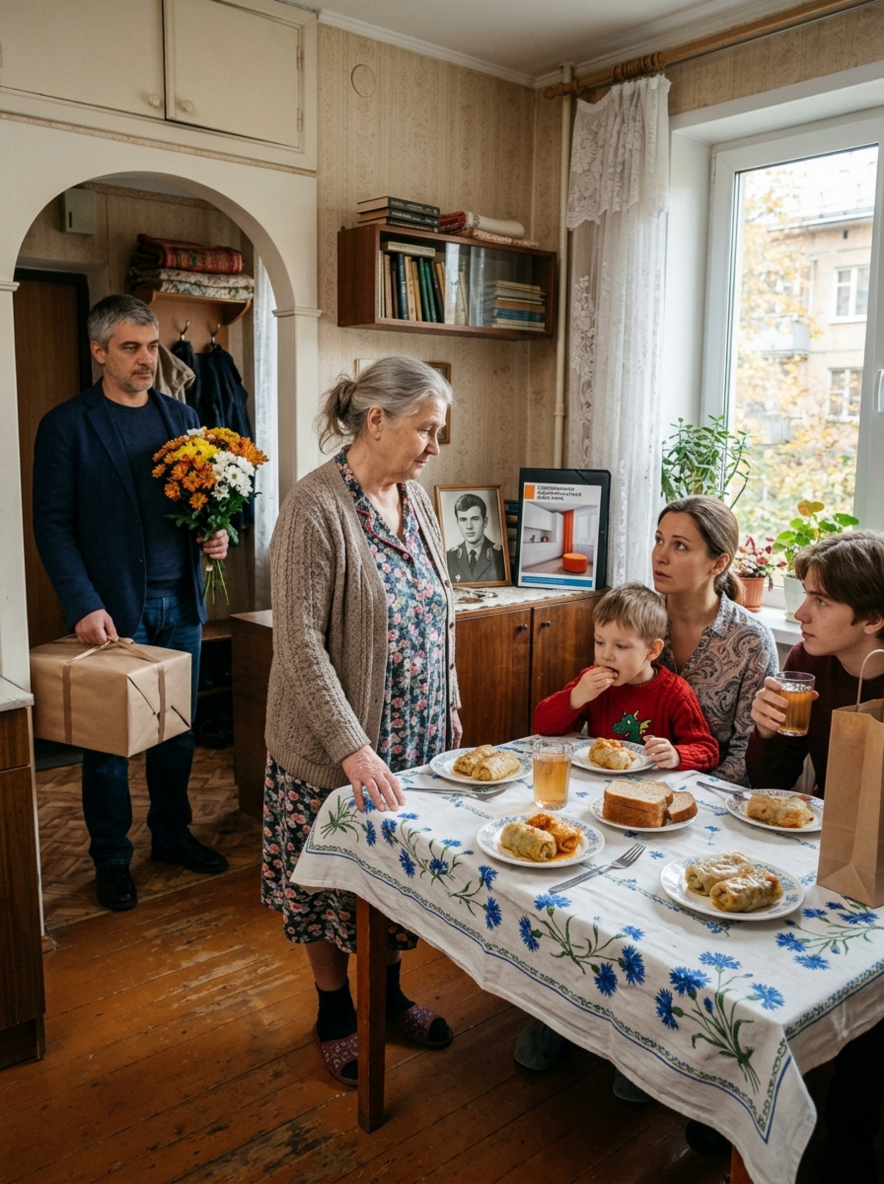 В одно из сентябрьских воскресений, под самый вечер, Оксана Сергеевна расставляла тарелки на столе, когда в прихожей резко хлопнула входная дверь. Звонка не последовало — у Олены имелся собственный ключ. По звукам Оксана безошибочно определила: Ярослав уже в коридоре сбрасывает кроссовки, шлёпая ими о плитку; Руслан вполголоса жалуется на заторы на Броварском проспекте; Олена аккуратно ставит пакет на тумбочку.