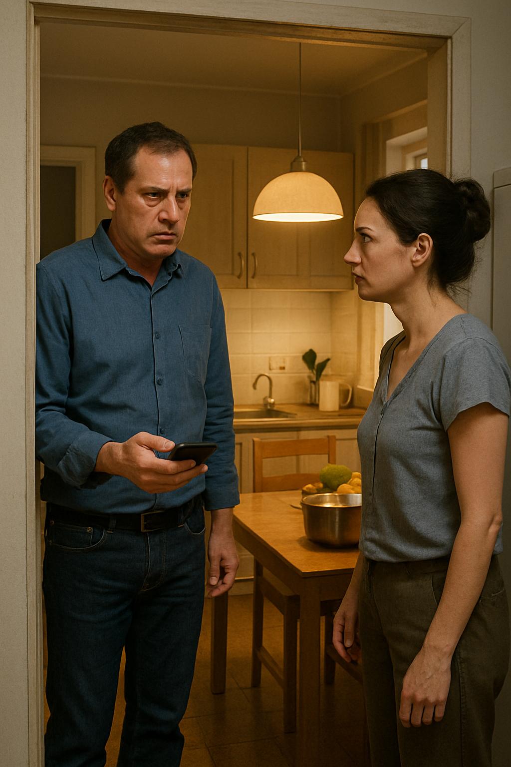 Он остановился на пороге кухни, всё ещё держа в руке телефон после разговора с матерью. Обычно уравновешенное и немного усталое после работы лицо теперь выражало смесь растерянности и раздражения. Он медленно опустил руку и посмотрел на жену так, будто увидел её впервые за долгое время.