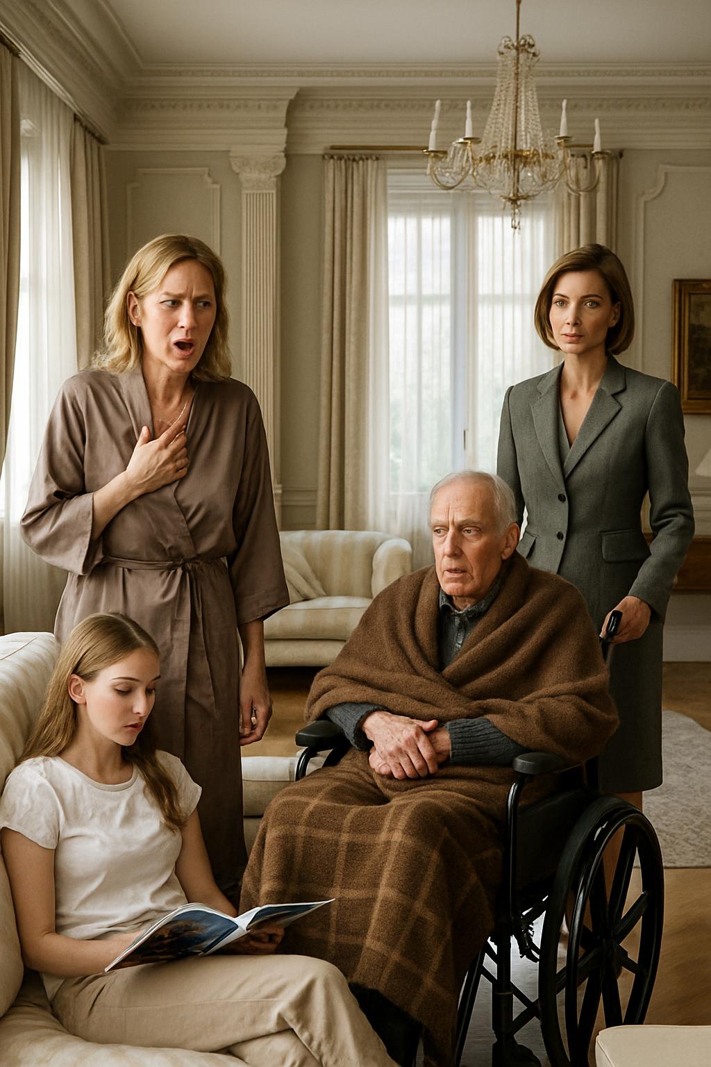 В этот момент массивные дубовые двери парадного входа распахнулись настежь. В холл въехало инвалидное кресло-каталка, которое аккуратно катил личный водитель Богдана. В кресле сидел сам хозяин дома — укутанный в тёплый плед и выглядевший уверенно. Рядом с ним шагала женщина с прямой осанкой и спокойным взглядом.