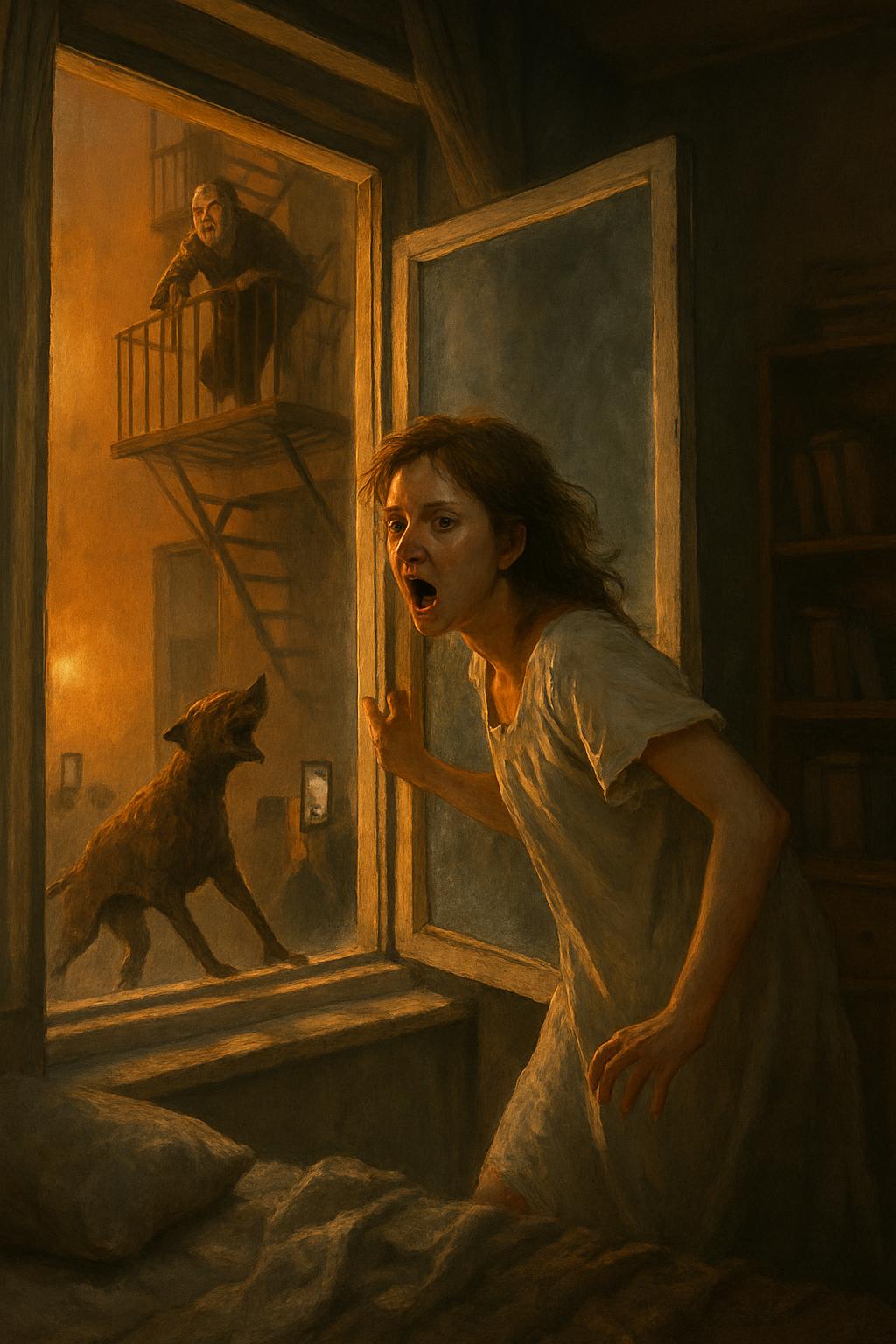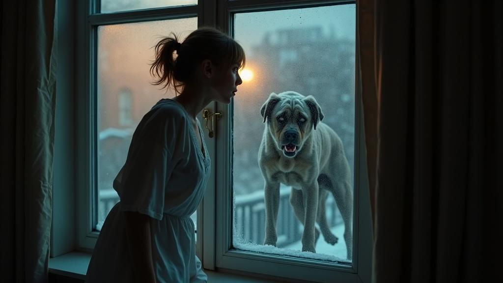Собака. Огромная, жилистая, с выступающими рёбрами. Она металась под лестницей, издавая хриплый яростный лай и время от времени подпрыгивая вверх — клыки щёлкали совсем рядом с ногами девушки. Та подтянула колени выше, но руки её уже почти не держали.