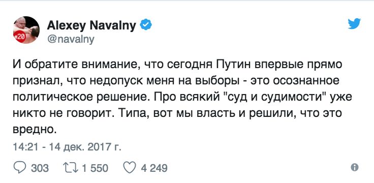 «Не могу не заметить, что Ксения — молодец. Вопрос сформулировала четко», — написал Навальный в твиттере. «И обратите внимание, что сегодня Путин впервые прямо признал, что недопуск меня на выборы — это осознанное политическое решение», — отметил Навальный.