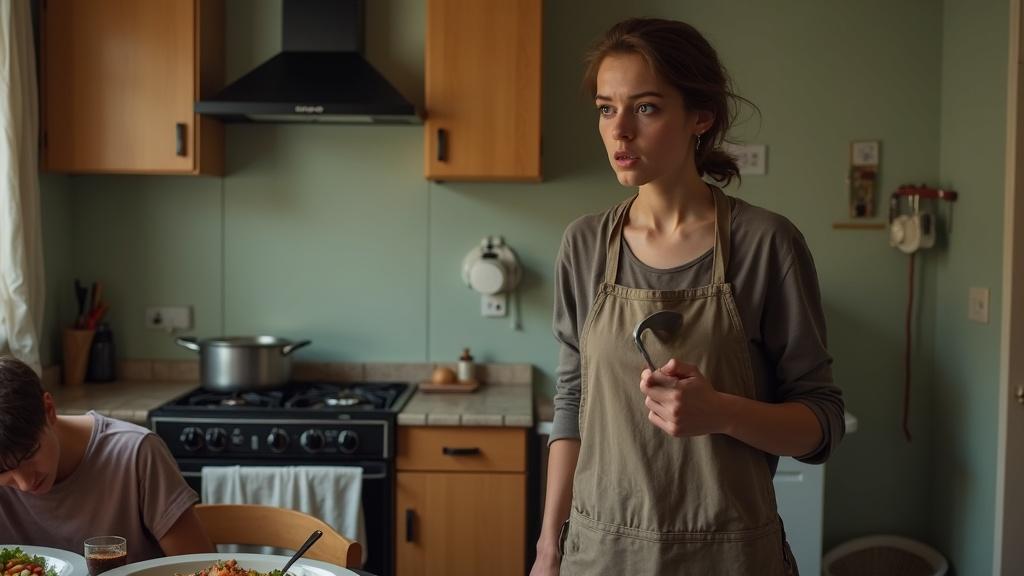 Оксана застыла у плиты с половником в руке. Всё её старание — годовщина, торт-сюрприз — рушилось прямо на глазах. Она обернулась к Богдану: тот сидел за столом с опущенным взглядом. Внутри неё теплилась надежда — может быть сейчас он наконец-то вмешается? Станет на её сторону? Но он молчал.