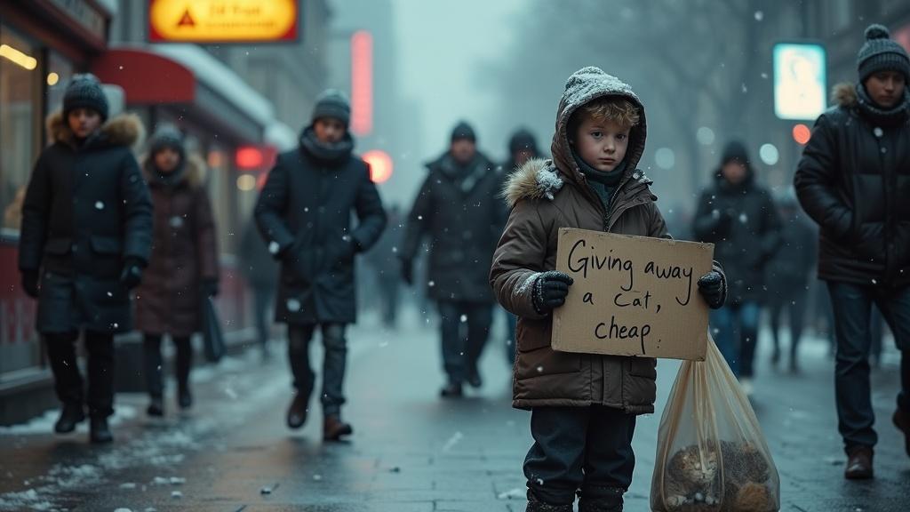 Мальчишка стоял у входа в метро и пытался пристроить кота. На листке из школьной тетради крупными буквами было написано: «Отдам кота, недорого». У его ног лежала сумка, из которой доносились шорохи — кто-то внутри явно ворочался. Видимо, сам кот. Люди проходили мимо, не задерживая взгляда — все спешили по домам: на улице пронизывающий ветер, конец декабря, снег хлестал в лицо колючими хлопьями. Не до животных… Мальчик выглядел жалко: замерзший, кутается в тонкую куртку.