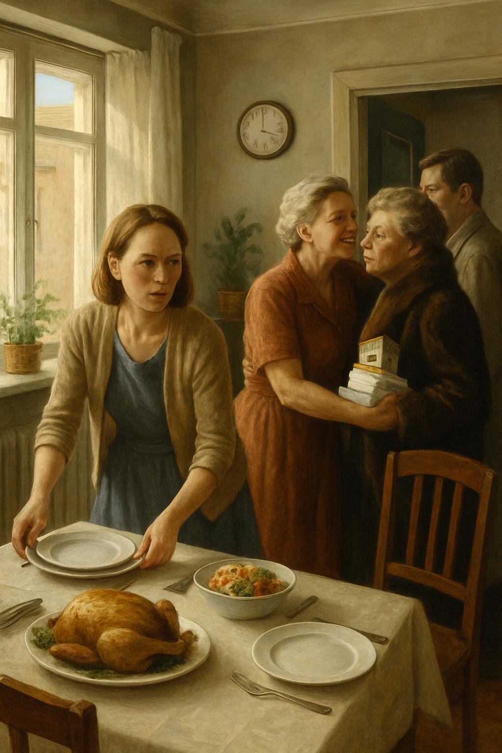 Суббота, четыре часа дня. Их новая квартира, взятая в ипотеку на два десятилетия, наполнялась ароматами запечённой курицы с яблоками, свежей краски и лёгкого волнения. Оксана провела у плиты почти двое суток. На столе уже красовались оливье, селёдка под шубой и салат с крабовыми палочками. Блюд было немного — как наверняка прокомментировала бы свекровь — но нарезано всё было до идеальности ровными кубиками. В духовке томилась курица. Оксана в который раз поправила аккуратно сложенные тарелки.