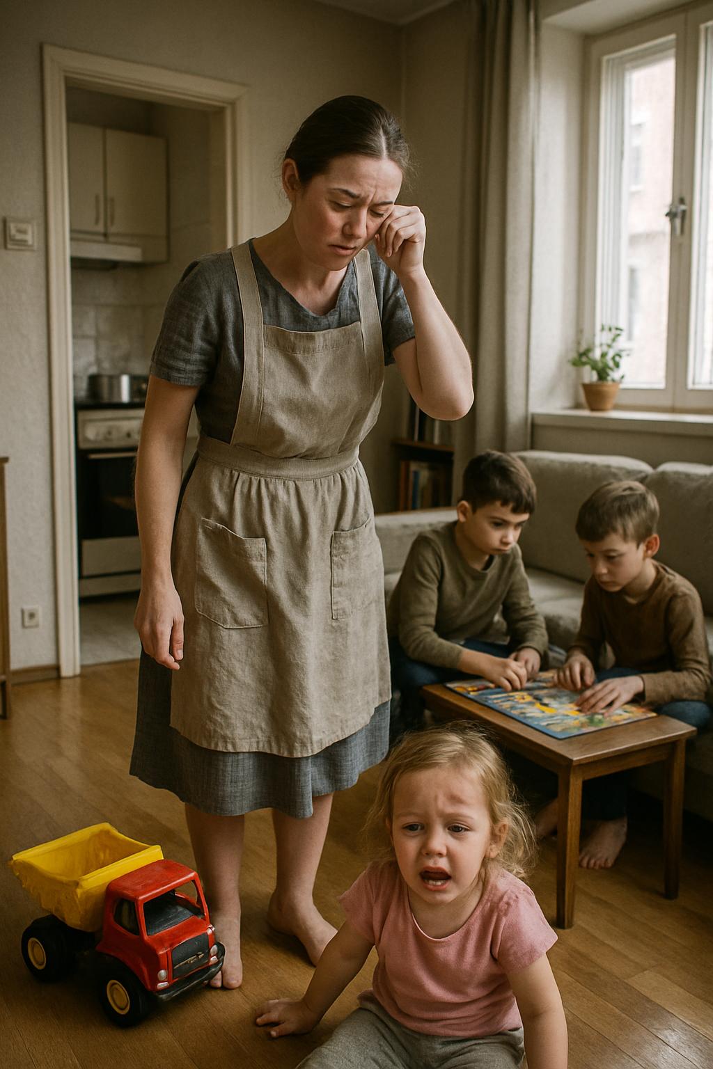 Оксана вошла в комнату вместе с малышами. Леся всхлипывала и держалась за мамину юбку, а Назар уже пришёл в себя после происшествия и теперь с интересом осматривал новое пространство вокруг себя; его глаза блестели от предвкушения игры или шалости.