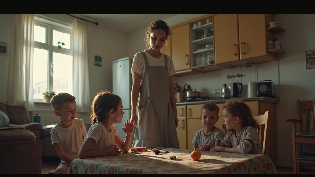 Оксана вошла в комнату вместе с малышами. Леся всхлипывала и держалась за мамину юбку, а Назар уже пришёл в себя после происшествия и теперь с интересом осматривал новое пространство вокруг себя; его глаза блестели от предвкушения игры или шалости.