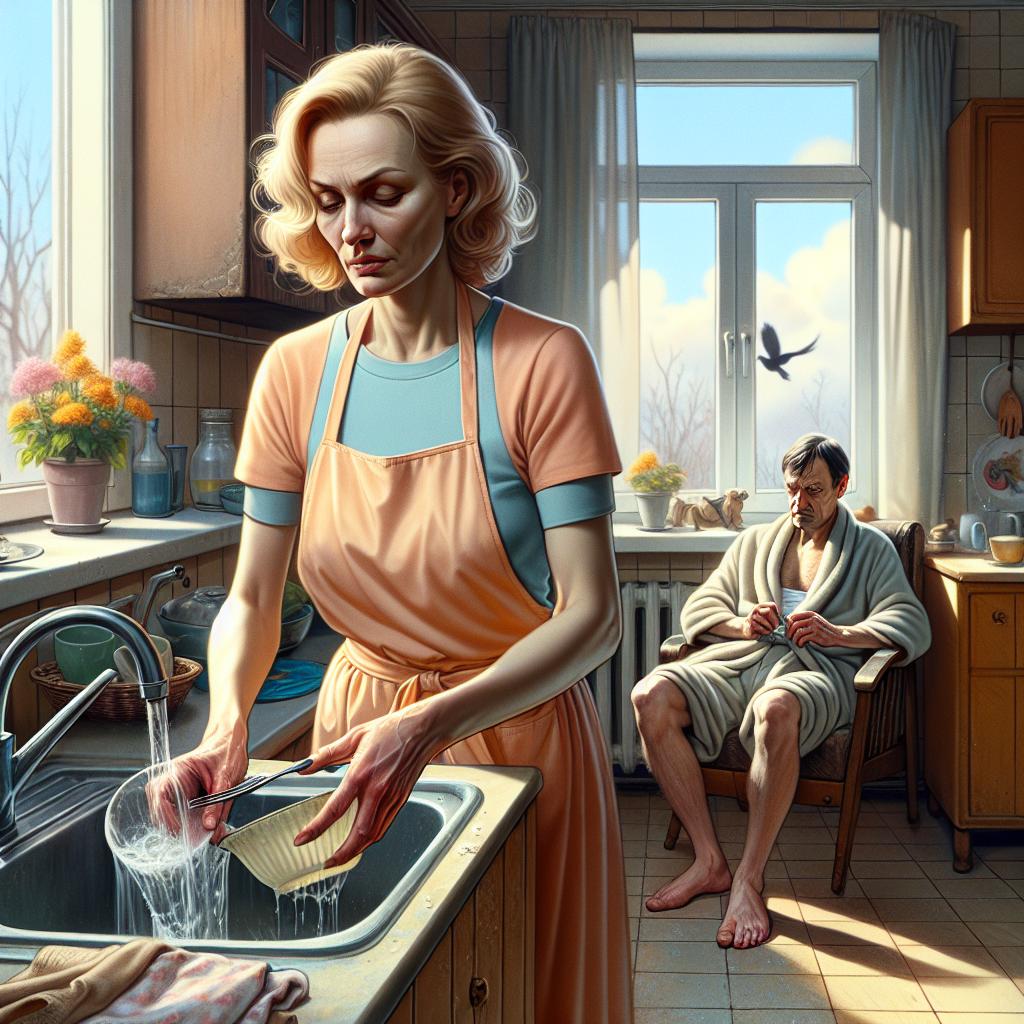 Дарина молча собрала со стола посуду. Его тарелка осталась почти полной — ужин снова пропал зря. Она поставила грязную посуду в раковину и открыла кран. Поток воды ударил по металлу мойки, заглушая звуки телевизора из гостиной, где устроился муж.