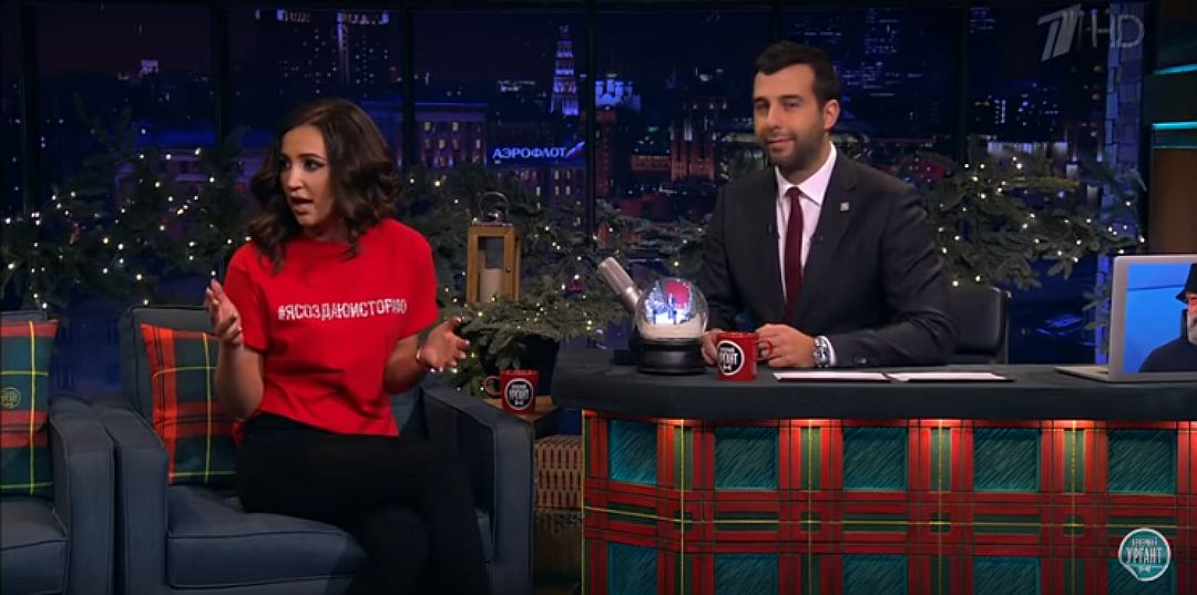 Телеведущая и начинающая певица Ольга Бузова стала гостьей очередного выпуска шоу «Вечерний Ургант». Звезда «Дома-2» появилась в студии программы в красной футболке с вышитым на груди хэштегом «Я создаю историю». Поводом для беседы послужила новая работа Ольги – ее пригласили вести передачу «Бабий бунт» на Первом канале.