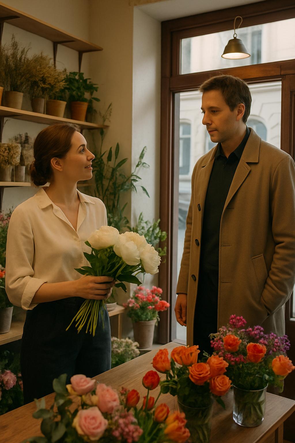 Александра аккуратно составляла букет из белоснежных пионов, когда в помещении раздался звон дверного колокольчика. В салон вошёл высокий мужчина в светлом пальто. Она подняла взгляд — и внутри что-то дрогнуло. В его облике была та спокойная, зрелая привлекательность, которая приходит лишь с годами.
