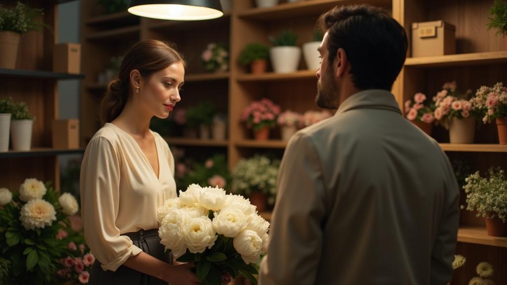 Александра аккуратно составляла букет из белоснежных пионов, когда в помещении раздался звон дверного колокольчика. В салон вошёл высокий мужчина в светлом пальто. Она подняла взгляд — и внутри что-то дрогнуло. В его облике была та спокойная, зрелая привлекательность, которая приходит лишь с годами.