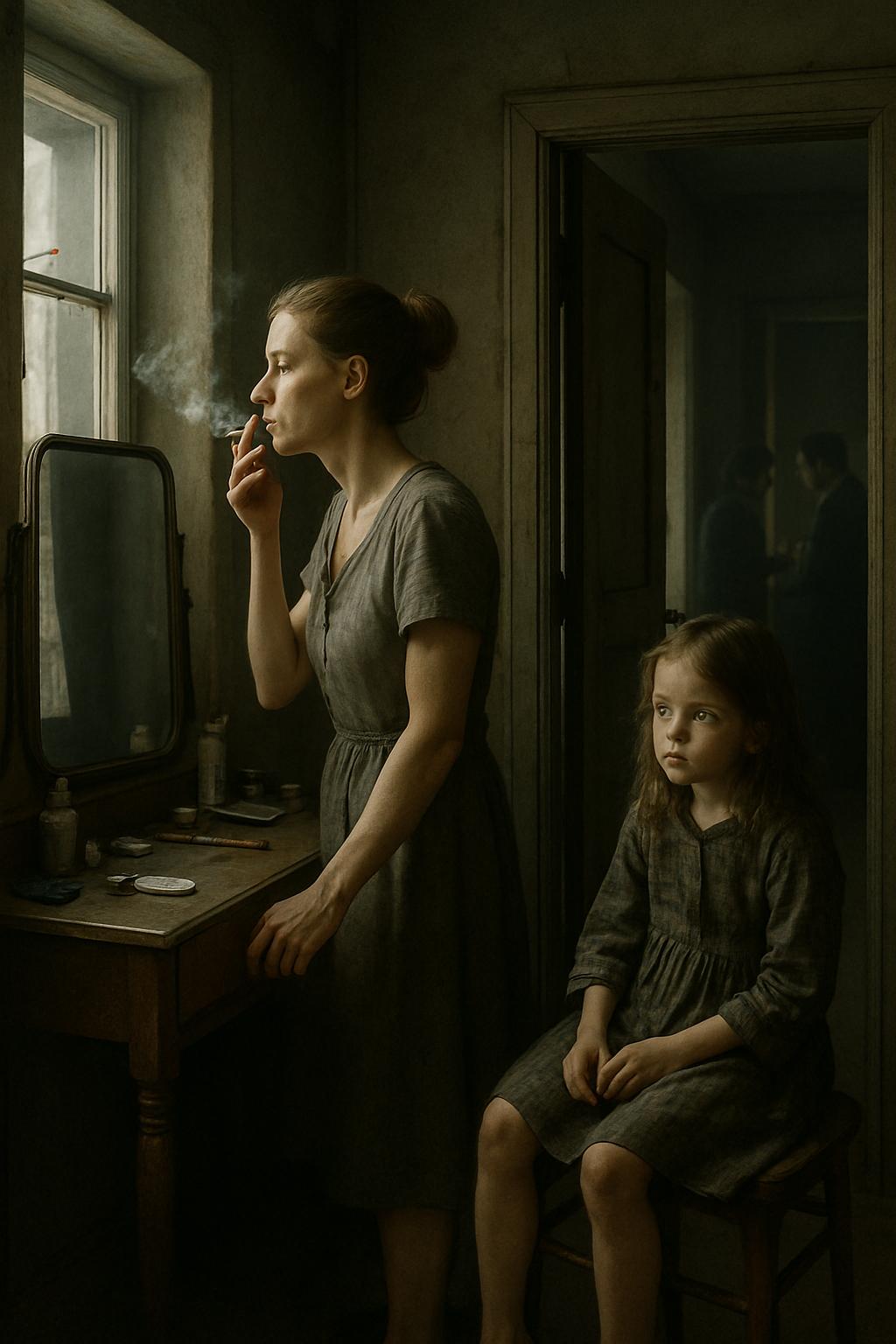 Оксана всегда бросалась в глаза. Высокая, ладная, с тяжелым пучком русых волос и цепким, оценивающим взглядом, она не плыла по течению, а будто проталкивала себе дорогу сквозь жизнь. К тридцати годам за её спиной остались развалившийся брак, несколько сомнительных историй и восьмилетняя дочь Мария. Девочка сейчас примостилась на табуретке, болтая ногами, и наблюдала, как мать наводит красоту перед потускневшим трюмо.