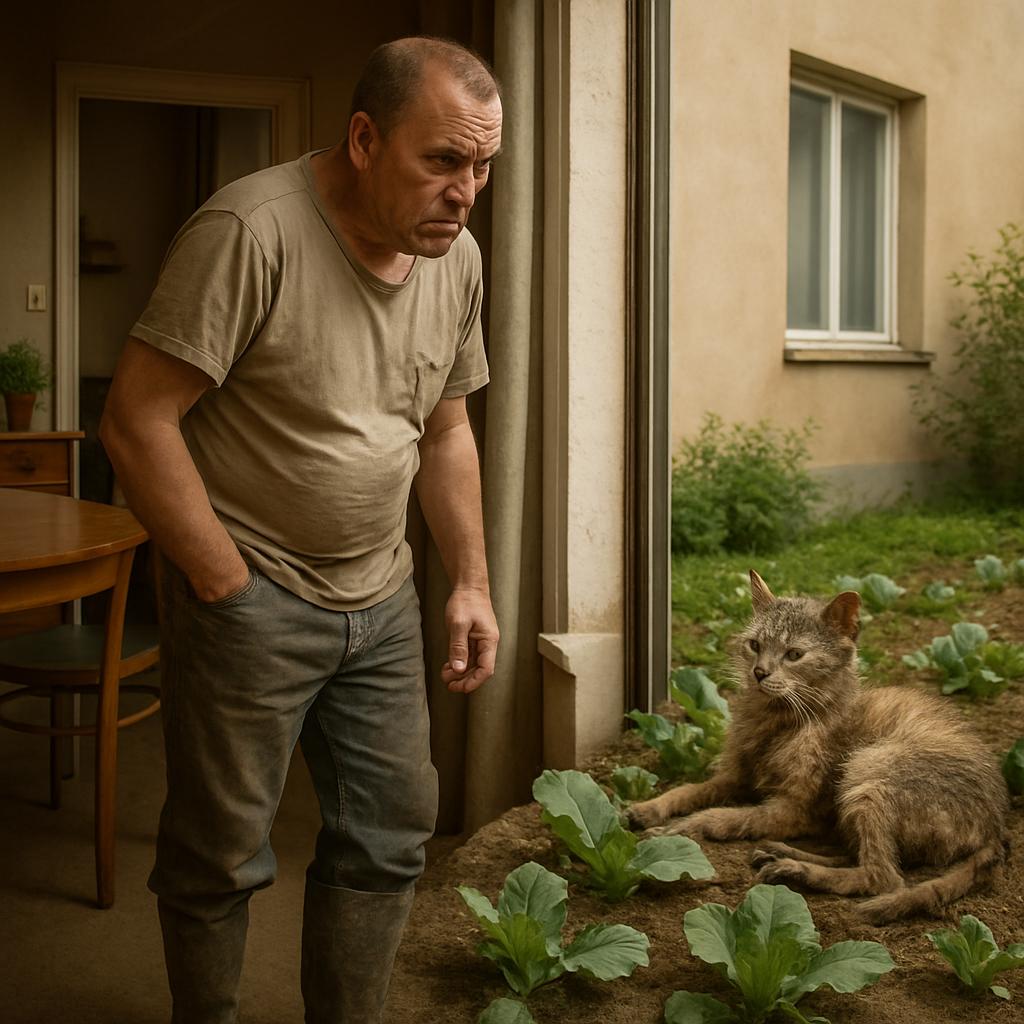 Тарас с досадой глядит в окно. Снова этот Никита устроился на его грядках! Уже третий день подряд. Сначала помял помидоры, потом дрых в огурцах, а сегодня и вовсе — прямо на молодой капусте примостился.