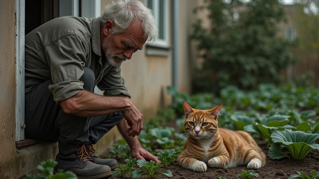Тарас натягивает резиновые сапоги и выходит в огород. Кот не убегает — лишь отходит немного в сторону и садится у забора. Худющий, весь потрёпанный. Одно ухо порвано, хвост весь в колючках.