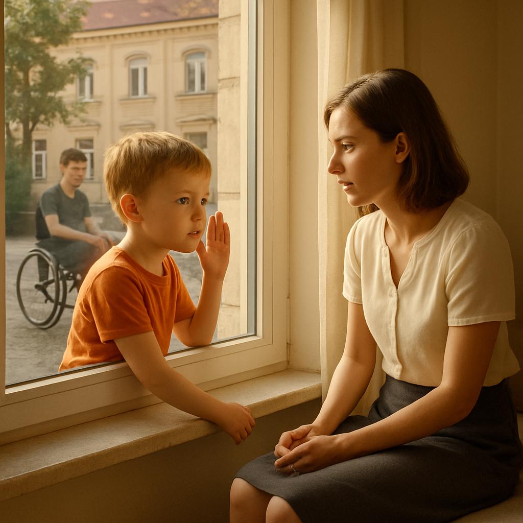 — Мам, а почему Ярослав не выходит к нам во двор? — неожиданно спросил Дмитрий, которому недавно исполнилось восемь. Он прижался к стеклу окна на первом этаже, в его взгляде читались и любопытство, и серьёзность… За стеклом едва заметно шевельнулась фигура — в комнате сидел Ярослав, мальчик постарше, неподвижно устроившийся в инвалидной коляске.