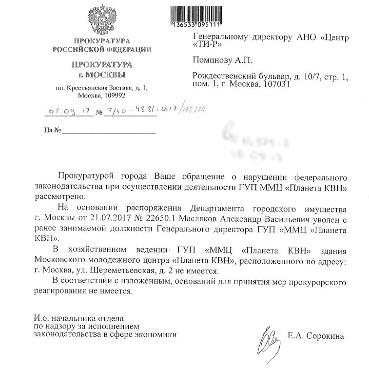 «В хозяйственном ведении ГУП «ММЦ Планета КВН» здания, расположенного по адресу ул.Шереметьевская, д.2 не имеется», – справедливо замечает прокуратура, и добавляет, что никаких оснований для принятия мер нет