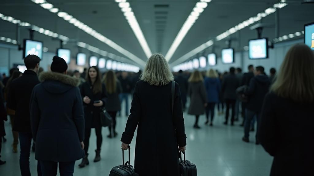 В зале регистрации царил ровный свет, но он не приносил уюта — потолочные лампы излучали холодное белое сияние, словно уставшее от бесконечного дня. За широкими окнами растекалось серое, почти безжизненное небо поздней осени; на стекле у входа остались следы высохших дождевых капель. Очередь к стойкам регистрации извивалась между натянутыми лентами, медленно продвигаясь вперёд. Пассажиры двигались неторопливо, время от времени бросая взгляды на табло и часы над стойками.