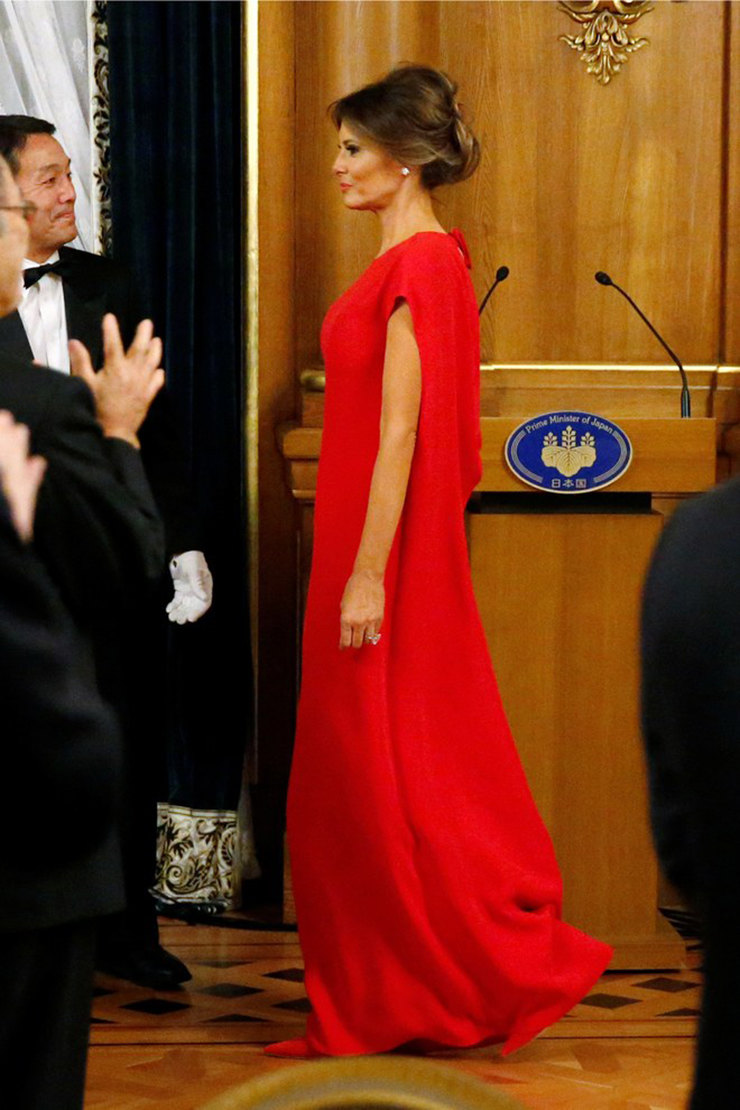 На приеме во дворце Акасака Первая Леди США была в свободном «тоге» от Valentino и красных лодочках Manolo Blahnik.