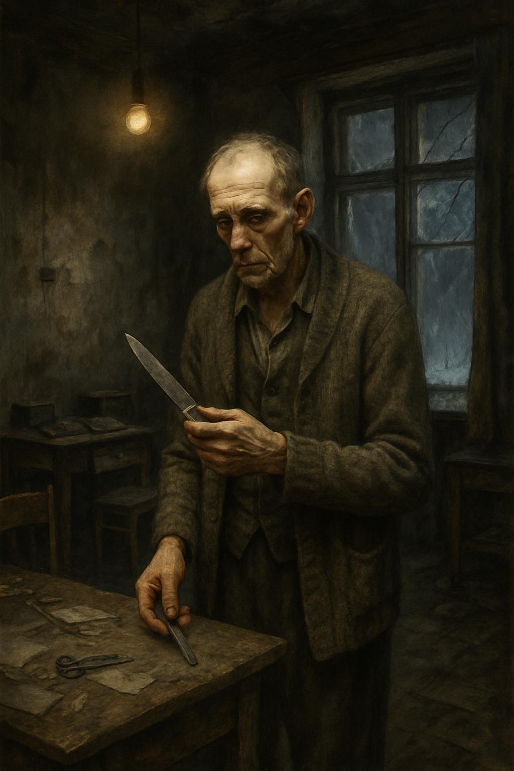 Когда трамваи остановились и прилавки магазинов покрылись пылью, Дмитрий всё ещё принимал заказы. Только теперь платой служили не деньги. «Дмитрий Иванович… у нас только картошка осталась…» — шептали женщины с виноватым видом и пустыми мешками в руках. Он молча кивал и продолжал точить ножи — надеясь на чашку горячего супа в знак благодарности. Но чаще всего дверь захлопывалась у него за спиной под аккомпанемент детского плача — голод не щадил никого. Иногда он возвращался домой и находил на пороге кусочек замёрзшего хлеба в газетной обёртке. Тогда он садился на ледяную лавку у подъезда и тихо произносил сквозь слёзы: «Спасибо вам… Не забыли…»