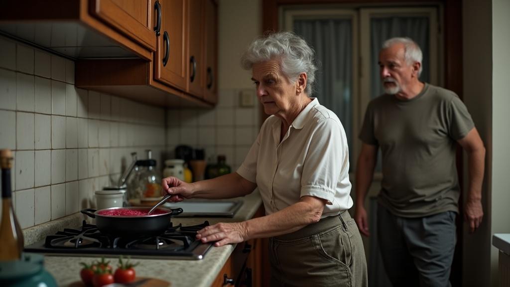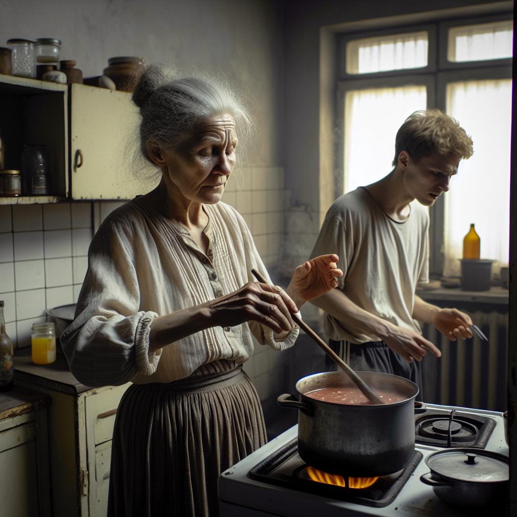 Оксана стояла у плиты, помешивая борщ. Богдан нервно расхаживал по кухне.