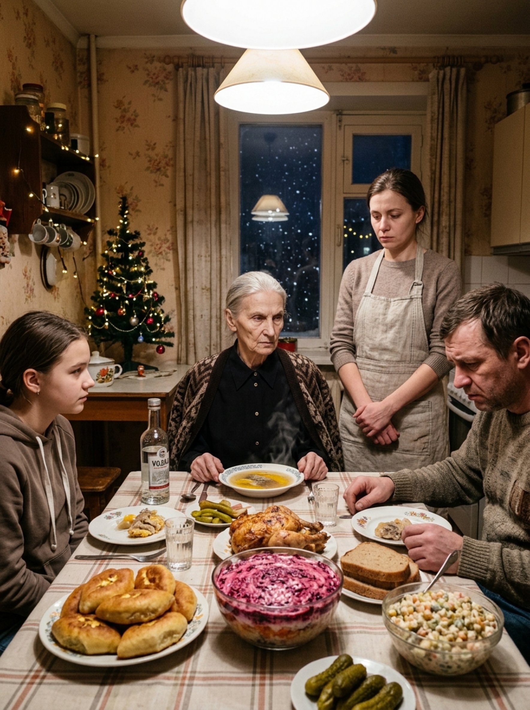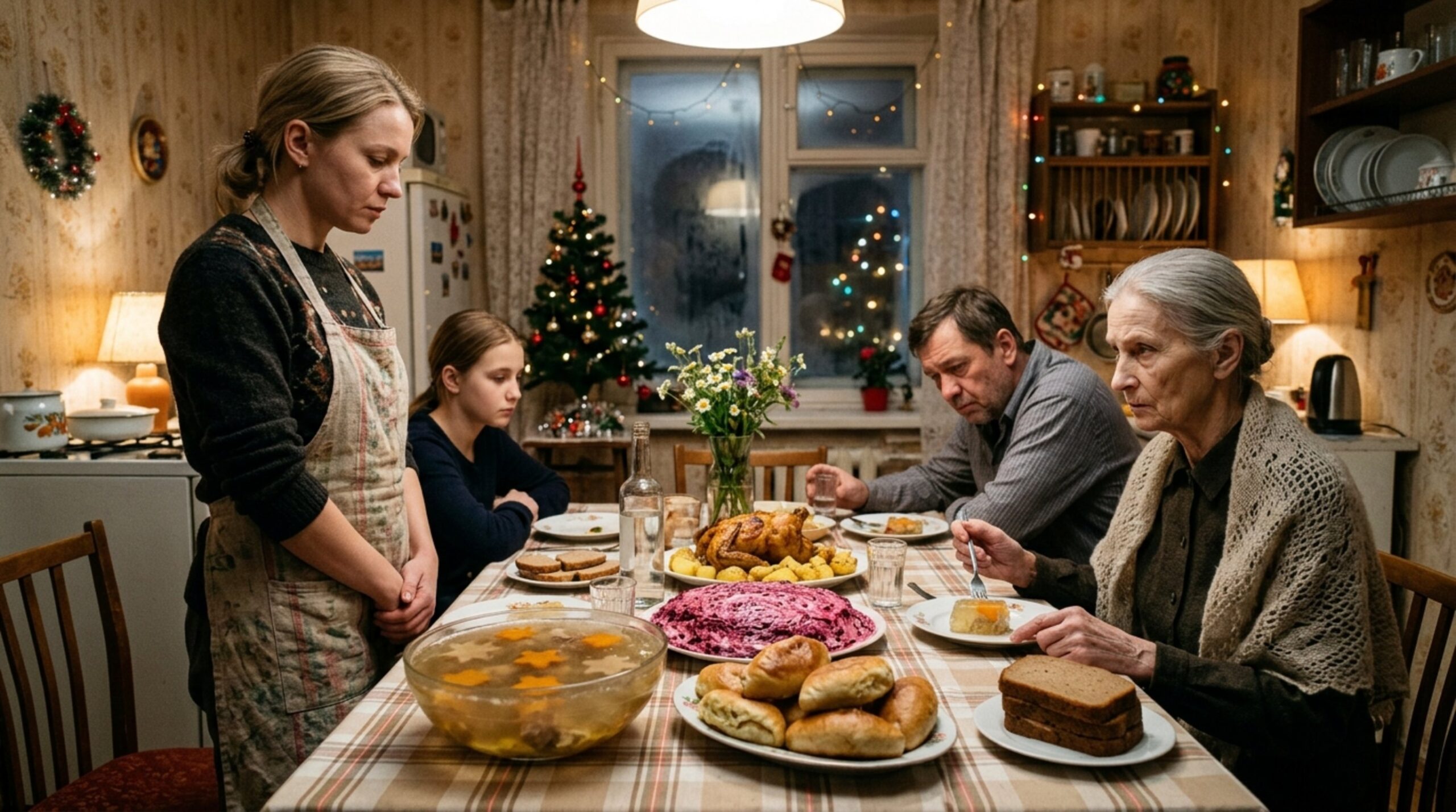 Наступил Новый год. Стол ломился от угощений: в глубоких блюдах дрожал прозрачный холодец с золотистыми прожилками, румяные пироги — с капустой и яйцом — источали пар, селёдка скрывалась под плотным слоем свёклы. В духовке с утра томилась курица, и по квартире разливался тот самый аромат праздника, знакомый с детства. Я расставила последнюю тарелку, вытерла ладони о фартук и позволила себе короткий вдох облегчения.