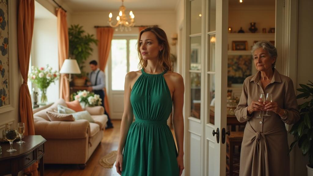 Из комнаты доносился смех, разговоры и звон бокалов. В воздухе витали ароматы духов и цветов. Я стояла в изумрудном платье — купленном на собственные деньги специально для этого вечера. Оно обошлось мне в половину зарплаты, но впервые за долгое время я чувствовала себя по-настоящему красивой. Лариса же смотрела на меня с тем самым выражением неодобрения, к которому я уже привыкла. Она явно ждала, что я молча удалюсь в спальню и вернусь в чём-то более «приемлемом» — спокойных тонов, скромном и неприметном. Именно такие наряды она предпочитала.