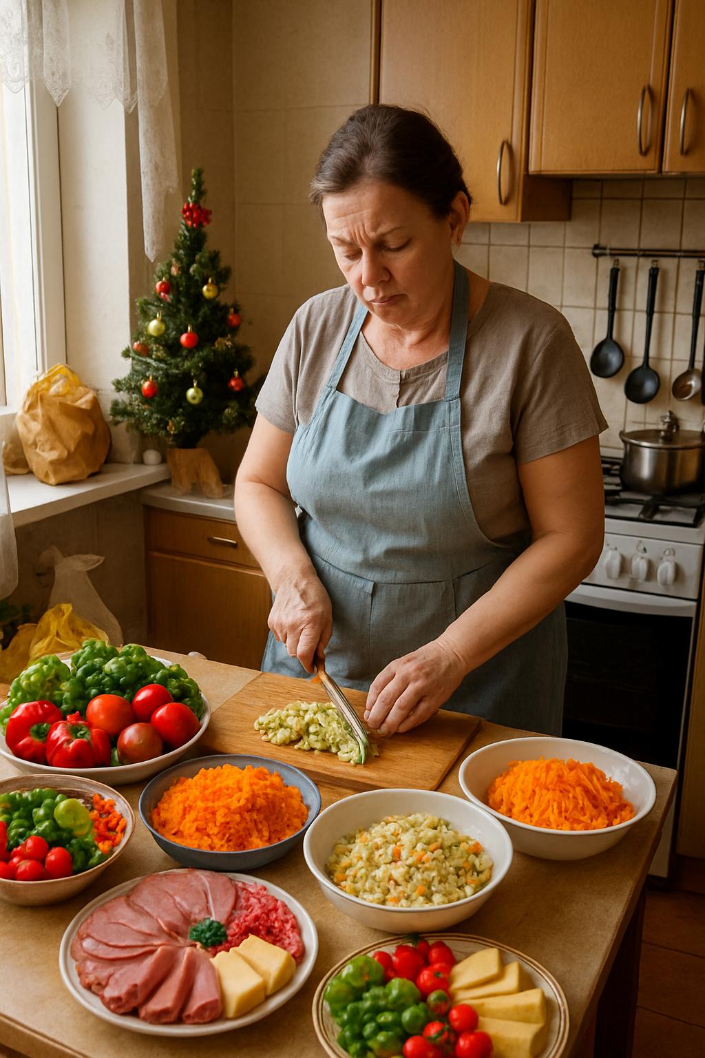 Утром тридцать первого декабря она поднялась в семь часов и принялась за готовку салатов: оливье с качественной колбасой, селёдка под шубой и мимоза с красной рыбой. Нарезала сырную тарелку — дорблю, камамбер и пармезан; мясную — буженина и карбонад; запекла мясо в фольге; выложила на блюдо фрукты: виноградные грозди, мандарины и киви.