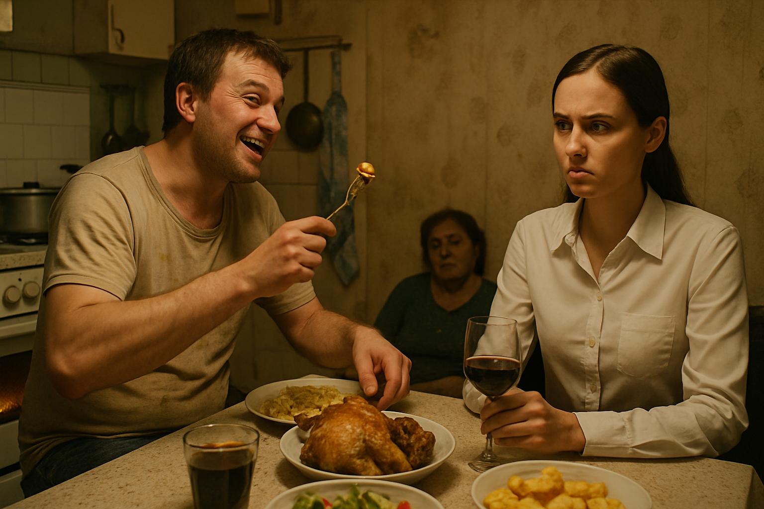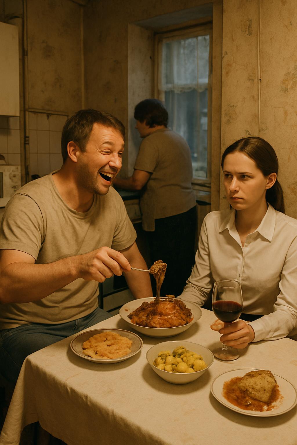 София сидела напротив матери, безупречно выпрямив спину. Белая офисная блузка на ней стоила дороже, чем весь кухонный гарнитур. Она молча наблюдала, как Богдан разливает по бокалам вино из картонной коробки, придерживая её обеими руками, будто это редкий коллекционный напиток. Его лицо блестело от жары и самодовольства. На этих шести квадратных метрах он ощущал себя хозяином — повелителем плиты и табуреток.