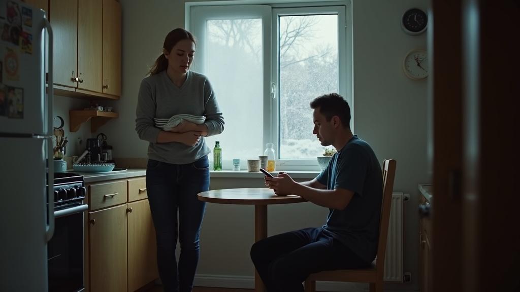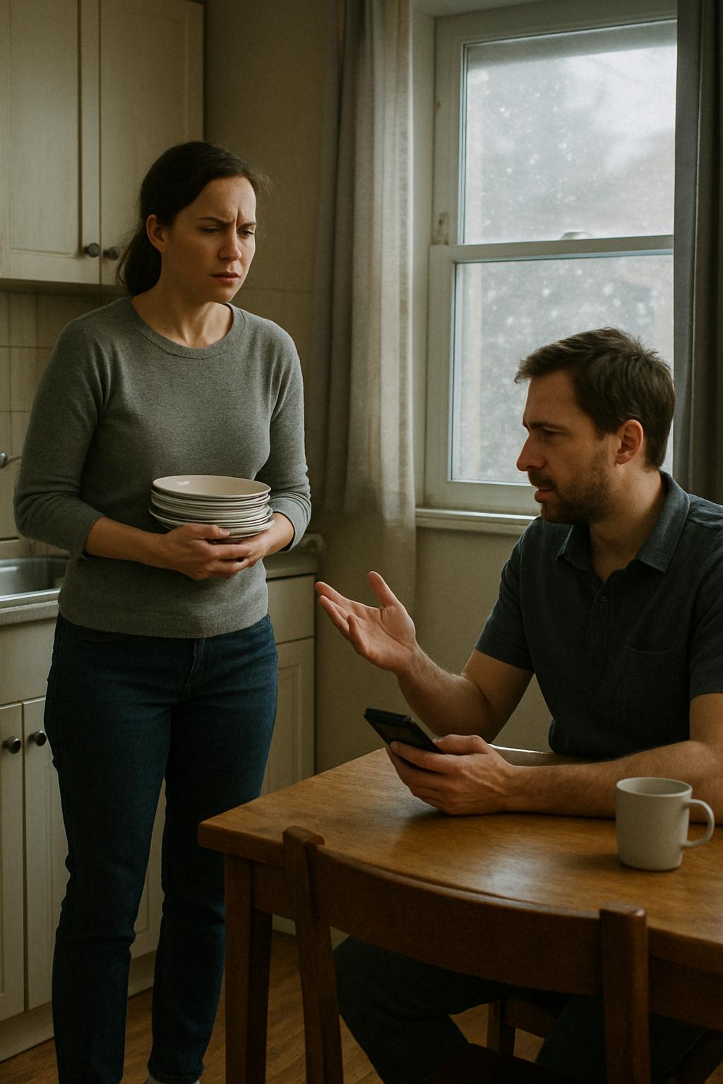 Оксана стояла посреди кухни, прижав к груди стопку тарелок. Муж сидел за столом, упрямо уткнувшись в экран телефона. Она уже знала это молчание — оно всегда предвещало что-то неприятное.