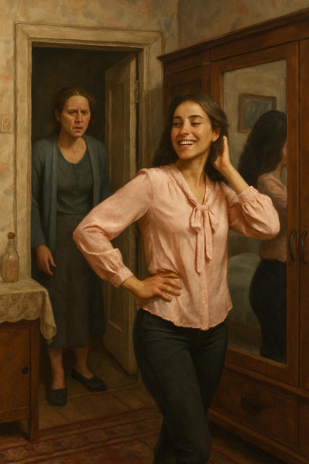 — Оленька, немедленно сними это! Ты что, совсем границ не чувствуешь? Это же шелковая блузка, я даже ярлык ещё не убрала! — Марта стояла в проёме спальни своей квартиры на Подоле, глядя с ужасом. Сумка с покупками медленно соскользнула с плеча и глухо шлёпнулась на пол — она даже не обратила внимания.