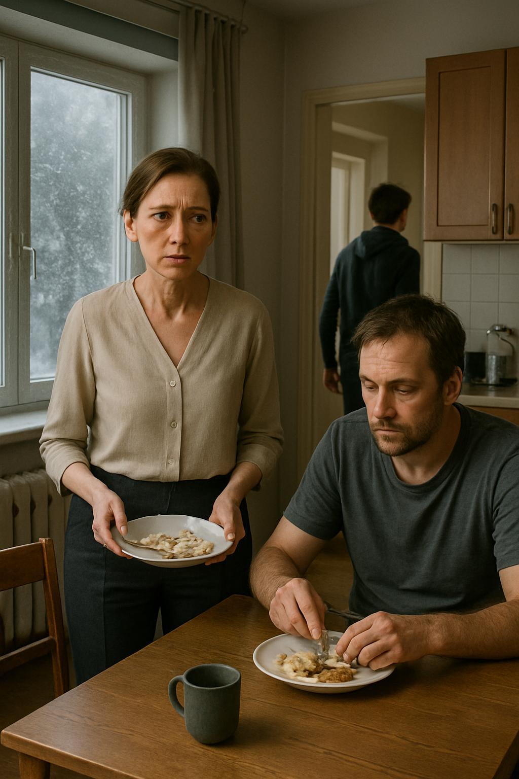 Оксана осторожно поставила тарелку. Их четырнадцатилетний сын Назар мгновенно схватил телефон и вышел из кухни — за годы он научился улавливать момент, когда родителям лучше поговорить без свидетелей.