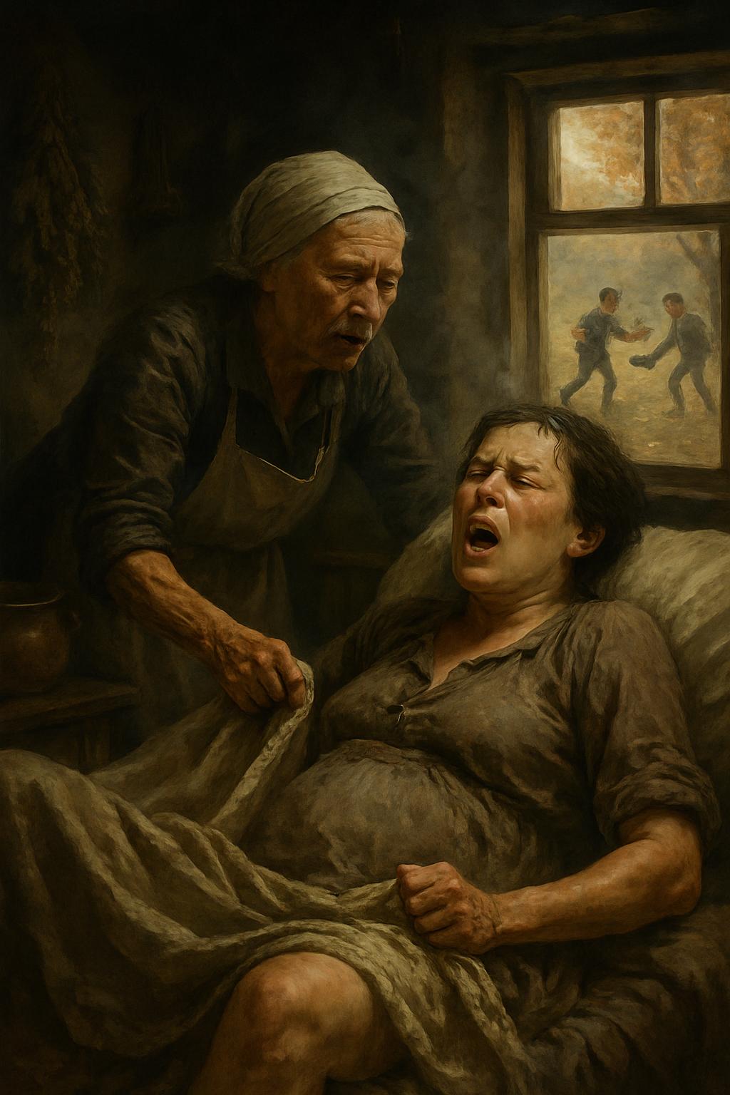 Осень 1941 года уверенно вступала в свои права, окрашивая деревья в алые и золотистые оттенки, принося с собой холод предстоящей зимы. В небольшой сельской хате, пропитанной запахом дыма и сушёных трав, на сбившихся подушках металась женщина. По её лбу стекали крупные капли пота, а губы были плотно сжаты от боли. Рядом хлопотала пожилая бабка-повитуха — её натруженные руки то поправляли простыни, то вытирали пот со лба роженицы.