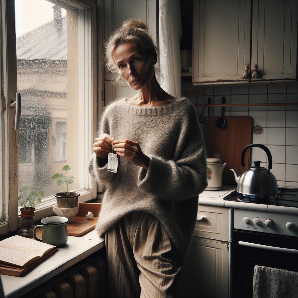 Оксана стояла у кухонного окна, медленно разворачивая чайный пакетик. За стеклом моросил октябрьский дождь — такой же серый и обыденный, как этот понедельник, как вся её жизнь в последние годы.