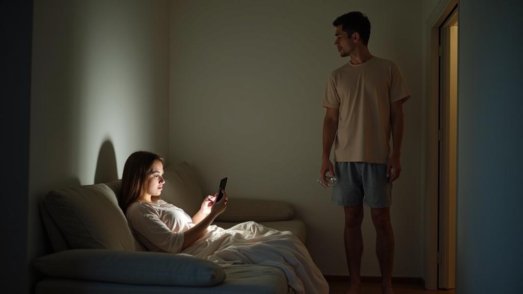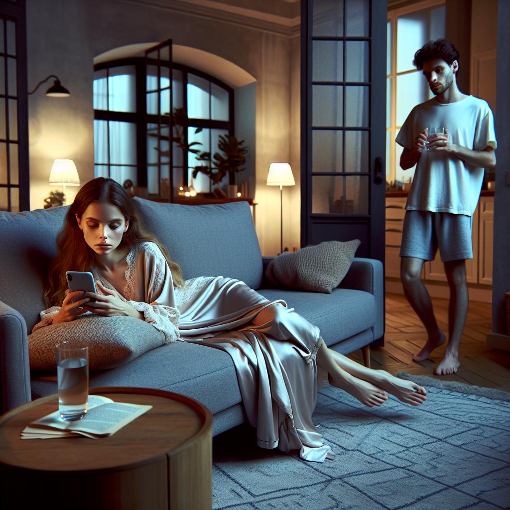 Марьяна лежала на диване спиной к двери, укрывшись пледом. Свет от экрана телефона мягко освещал её лицо.