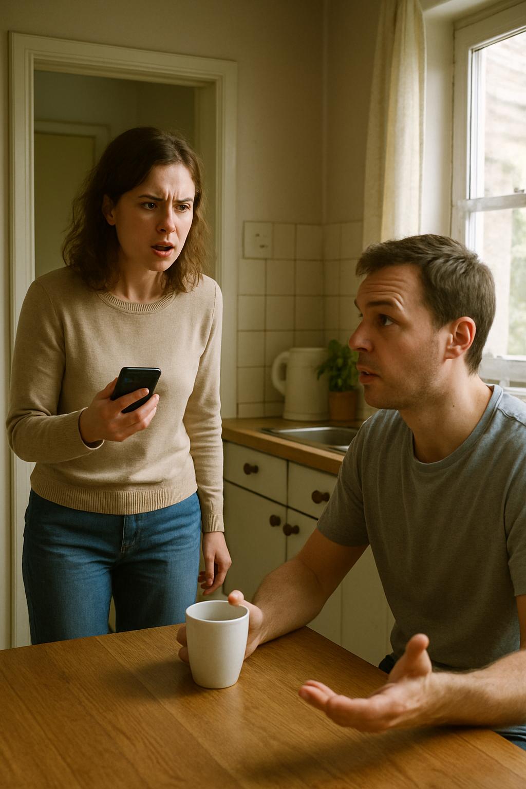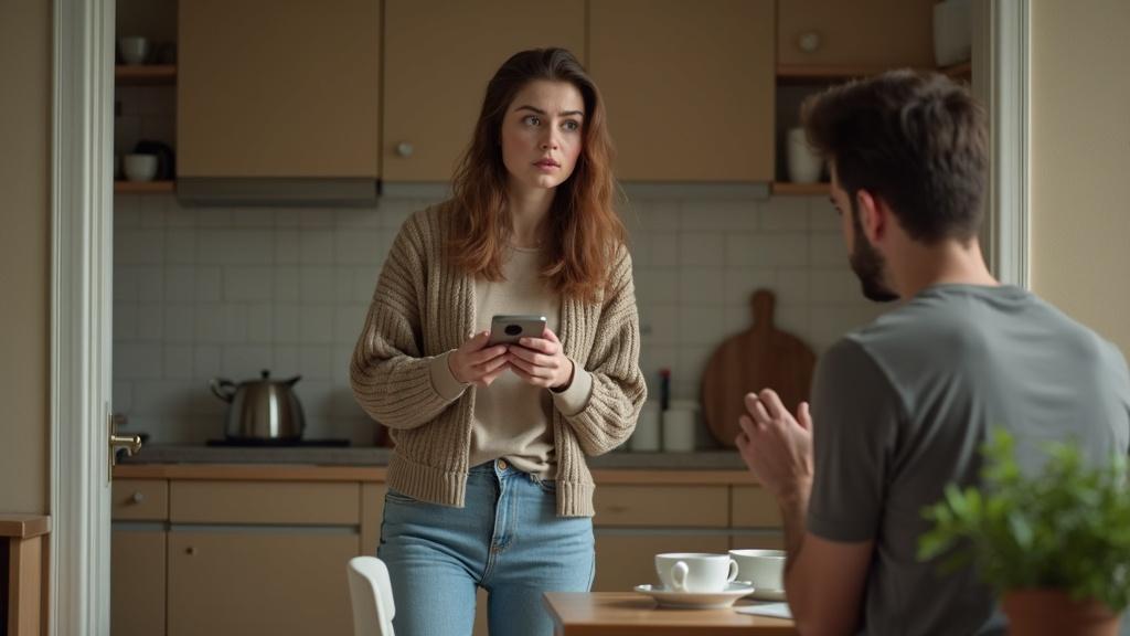 Анастасия стояла на пороге кухни, с телефоном в руке и лицом, в котором смешались обида и недоумение. Роман оторвался от чашки кофе, словно его прервали во время чего-то важного.